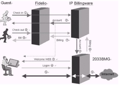 本方案將Dr.COM計(jì)費(fèi)系統(tǒng)作為一個(gè)部件嵌入到酒店現(xiàn)有的管理軟件系統(tǒng)里。這樣做的好處是酒店經(jīng)營(yíng)者不必面對(duì)兩套系統(tǒng)。