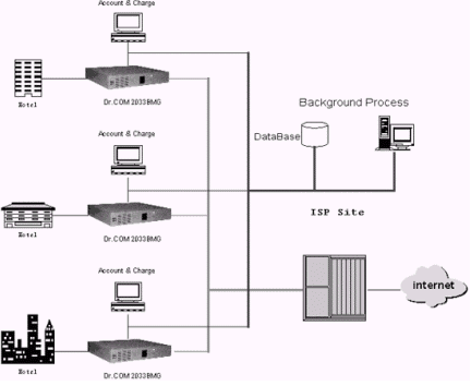 利用Dr.COM 2033BMG,配合路由器、五類雙絞線(或者機(jī)頂盒、ADSL),實(shí)現(xiàn)計(jì)費(fèi)和客房Internet寬帶接入。