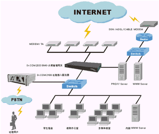 Dr.COM 2188遠(yuǎn)程接入服務(wù)器系列產(chǎn)品,該系列產(chǎn)品向用戶提供了內(nèi)置的15個(gè)MODEM用作遠(yuǎn)程接入,配套提供專業(yè)開戶、計(jì)費(fèi)、統(tǒng)計(jì)、監(jiān)視和查詢等網(wǎng)絡(luò)版營(yíng)運(yùn)軟件及數(shù)據(jù)庫(kù)接口和串行計(jì)費(fèi)接口。使校園網(wǎng)用戶可通過公用電話網(wǎng)(PSTN)對(duì)校園網(wǎng)內(nèi)資源進(jìn)行訪問。