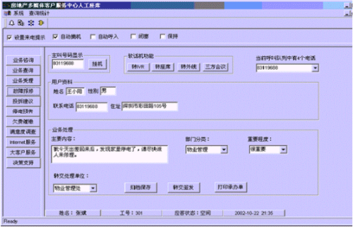 。。接通呼叫中心的電話后,按語音提示選擇相應的服務,選擇相應的服務功能鍵后,在服務人員的計算機屏幕上自動彈出對話框顯示用戶的詳細信息。