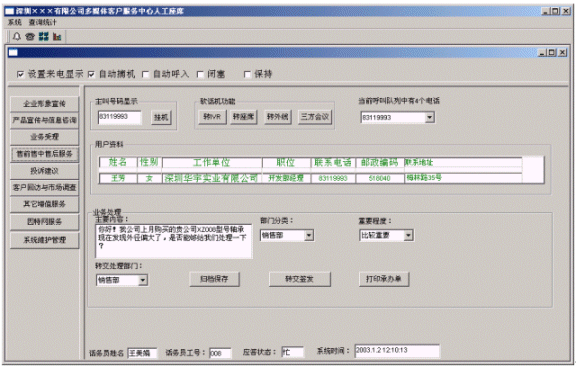 ◇提高企業(yè)親切感:系統(tǒng)在人工服務(wù)狀態(tài)下,當(dāng)業(yè)務(wù)代表輸入客戶名稱時(shí),系統(tǒng)即時(shí)將客戶與企業(yè)相關(guān)的信息顯示在座席終端上,使業(yè)務(wù)及時(shí)了解客戶,有針對(duì)性回答客戶問(wèn)題,使客戶倍感親切。