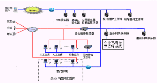 網(wǎng)上服務(wù)系統(tǒng):與INTENET結(jié)合,接受來(lái)自網(wǎng)上的呼叫請(qǐng)求,提高服務(wù)和營(yíng)銷的質(zhì)量和效率。