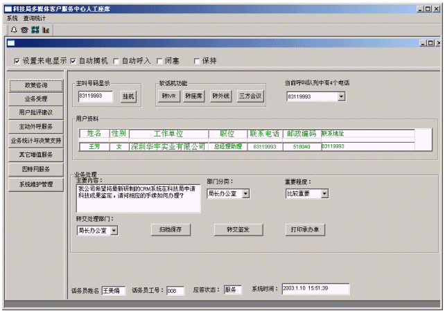 企業(yè)或個(gè)人打入電話后,可以選擇人工服務(wù),同座席話務(wù)人員直接溝通,由話務(wù)人員將企業(yè)或個(gè)人反映的問題和提出的建議意見記錄下來,并同時(shí)記錄下該客戶的聯(lián)系方式,將相關(guān)數(shù)據(jù)添加入系統(tǒng)數(shù)據(jù)庫(kù);也可以在數(shù)據(jù)庫(kù)的支持下回答企業(yè)或個(gè)人對(duì)科技成果和政策法規(guī)的咨詢和疑問。企業(yè)或個(gè)人也可以選擇自動(dòng)語(yǔ)音服務(wù)方式,根據(jù)系統(tǒng)的語(yǔ)音提示輸入按鍵,選擇類別,將自己的投訴和建議以及自己的聯(lián)系方式信息以留言錄音的方式保存在系統(tǒng)中。系統(tǒng)同時(shí)還支持自動(dòng)傳真方式,企業(yè)或個(gè)人可以通過傳真機(jī)打通客戶服務(wù)中心,通過按鍵選擇傳真方式,將自己的意見建議等的文本內(nèi)容傳真給系統(tǒng),系統(tǒng)自動(dòng)接受并存入數(shù)據(jù)庫(kù)。