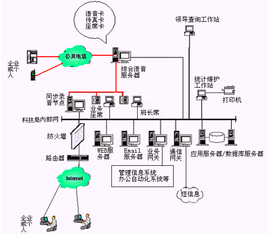 應(yīng)用現(xiàn)代先進(jìn)的CTI技術(shù)建立的科技局公開電話系統(tǒng),改變了傳統(tǒng)的科技局辦公的一部電話、一支筆、一個(gè)本(或用計(jì)算機(jī)當(dāng)打字機(jī))的記錄、交流模式。在充分利用各級(jí)科技局現(xiàn)有辦公自動(dòng)化系統(tǒng)基礎(chǔ)上,通過共享科技局、社會(huì)網(wǎng)絡(luò)資源,能夠?yàn)槠髽I(yè)或個(gè)人提供了更多、更好、更便捷的服務(wù)。