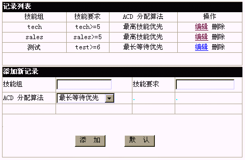 設(shè)置技能組:定義一個技能組名稱,給出一項技能的值范圍表達式,凡具備該技能且技能值屬于該范圍的座席,將自動加入該技能組。