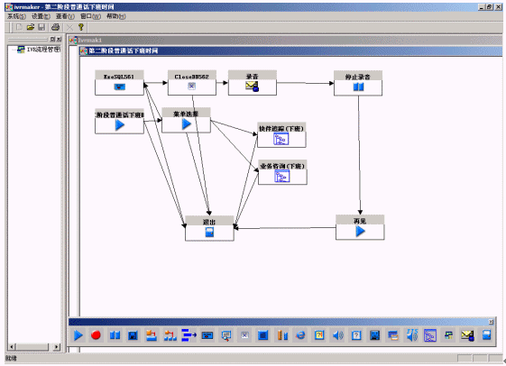 系統(tǒng)提供圖形化的語音流程生成環(huán)境,以方便用戶對語音流層進行定制。流程生成器是一套可視化的流程設(shè)計工具,通過拖拉圖標(biāo)控件、鼠標(biāo)連線即實現(xiàn)呼叫中心CTI流程的制作,同時,通過運行時鏈接動態(tài)連接庫(DLL),實現(xiàn)對業(yè)務(wù)數(shù)據(jù)庫的訪問;通過運行時鏈接用戶DLL,最靈活地與用戶應(yīng)用系統(tǒng)結(jié)合;支持多種業(yè)務(wù)集成和動態(tài)流程控制,方便用戶拓展業(yè)務(wù);采用事件驅(qū)動機制、開放的結(jié)構(gòu),滿足各種語音系統(tǒng)的需要;支持不限個數(shù)、級數(shù)的IVR結(jié)構(gòu),可滿足用戶非常復(fù)雜的需求。