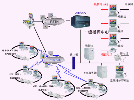 該熱線(xiàn)系統(tǒng)能與Internet、數(shù)據(jù)庫(kù)系統(tǒng)很好地集成,實(shí)現(xiàn)城市各級(jí)部門(mén)之間數(shù)據(jù)共享和各種其它不同的業(yè)務(wù)功能,以建設(shè)部為中心、各職能聯(lián)動(dòng)2級(jí)網(wǎng)絡(luò)系統(tǒng)和搶修維護(hù)服務(wù)端三個(gè)部分組成,利用AltiCenter基于IP的分布式呼叫中心技術(shù),可以實(shí)現(xiàn)建設(shè)部12319服務(wù)中心,屬下各個(gè)職能部門(mén)建立異地分中心,利用現(xiàn)有的PSTN電話(huà)網(wǎng)/INTERNET互聯(lián)網(wǎng),將1,2,3級(jí)網(wǎng)絡(luò)組成一個(gè)集語(yǔ)音和數(shù)據(jù)傳輸為一體的多媒體網(wǎng)絡(luò)系統(tǒng),并提供對(duì)任何方式的服務(wù)進(jìn)行全程錄音、質(zhì)檢功能,最終結(jié)果反饋到統(tǒng)一指揮服務(wù)中心。