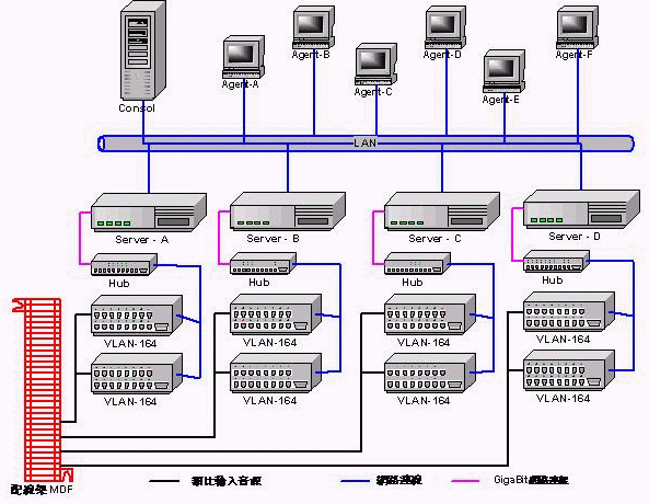 - 系統(tǒng)主要包括二大主機并由網絡聯機(TCP/IP協議)作為彼此與遠程的溝通橋梁。一是錄音接口主機(VLAN-164)具備模擬輸入音源的匹配接口、音源數字化、網絡聯機輸出。一是數據庫服務器(DataBase