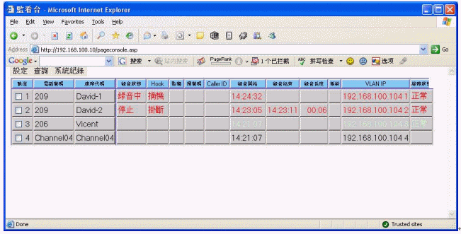 監(jiān)看臺:系統(tǒng)登入后的主畫面,可以監(jiān)控各路電話的當前使用情況(包括來電號碼、去電號碼、振鈐次數、錄音開始時間、錄音結束時間、線路狀況等信息)。并可以實現對任意通話的網絡實時監(jiān)聽。