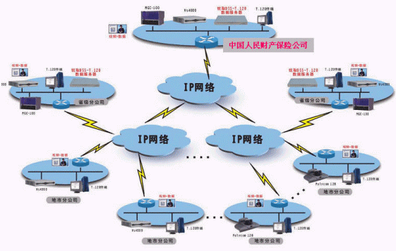 中國人民財產保險股份有限公司,是中國內地最大的非壽險公司,香港證交所上市公司。經過50多年的發(fā)展,中國人保財險公司已經發(fā)展成為網點遍布全國31個省市區(qū),共有營業(yè)機構4000余個的大型商業(yè)公司。為提高辦公效率,降低差旅成本,中國人保財險公司決定建設覆蓋從總公司、省分公司到地市分公司的視頻會議系統(tǒng),項目總容量達600多個節(jié)點,采用兩級級連方式組網,要求系統(tǒng)具備視頻、音頻、數(shù)據交互功能,。