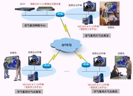 在上圖的應用案例中,DSS-T.120數(shù)據(jù)會議服務器和MCU通常放置在省氣象局網(wǎng)絡中心,視頻會議終端和預報員工作平臺(MICAPS系統(tǒng))放置在各級氣象部門的天氣會商室中。在進行遠程可視天氣會商時,系統(tǒng)通過MCU和視頻會議終端進行視頻、音頻的交互;通過DSS-T.120數(shù)據(jù)會議服務器和運行在預報員工作平臺上的T.120終端軟件進行數(shù)據(jù)的交互,各級預報員在彼此之間看到圖像聽到聲音的同時,可以看到正在做匯報的預報員共享的MICAPS系統(tǒng)中的內容,如高空圖、地面圖、云圖等預報基礎素材,觀看效果如同在本地會商室一樣。在本案例中通過T.120數(shù)據(jù)會議系統(tǒng)與視頻會議系統(tǒng)的配合,可以進行視頻、音頻、數(shù)據(jù)全面的交互,真正實現(xiàn)了預報員之間"面對面"的交流。