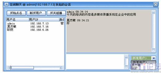 系統(tǒng)增加了多方文字互動(dòng)聊天功能,在線(xiàn)聊天功能可以選擇給所有人員發(fā)送消息,也可以選擇給某一特定人員發(fā)送。這樣在會(huì)議或培訓(xùn)的過(guò)程中,管理員可以選擇性的提出相應(yīng)的問(wèn)題給相關(guān)人員,考核相關(guān)人員的培訓(xùn)效果;其他人員也可以將會(huì)議或培訓(xùn)過(guò)程中遇到的疑問(wèn)、難點(diǎn)及時(shí)的反應(yīng)給管理員進(jìn)行解答,增強(qiáng)會(huì)議的成效。
