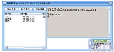 系統(tǒng)增加了多方文字互動聊天功能,在線聊天功能可以選擇給所有人員發(fā)送消息,也可以選擇給某一特定人員發(fā)送。這樣在會議或培訓(xùn)的過程中,管理員可以選擇性的提出相應(yīng)的問題給相關(guān)人員,考核相關(guān)人員的培訓(xùn)效果;其他人員也可以將會議或培訓(xùn)過程中遇到的疑問、難點及時的反應(yīng)給管理員進(jìn)行解答,增強(qiáng)會議的成效。