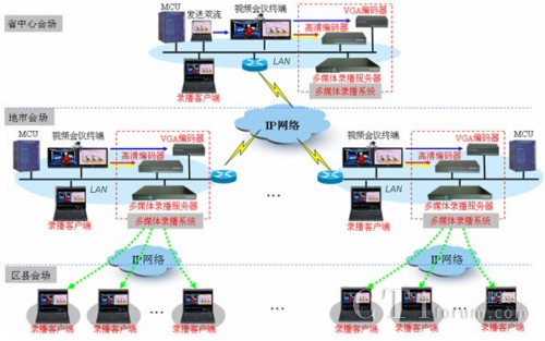 項(xiàng)目中采用了17套銳取高清錄播系統(tǒng),分別部署省國(guó)稅及下轄16個(gè)州、市國(guó)稅。銳取高清錄播系統(tǒng)采用分布式產(chǎn)品架構(gòu),由多媒體錄播服務(wù)器和前端的編碼器組成。多媒體錄播服務(wù)器部署在網(wǎng)絡(luò)機(jī)房;高清編碼器和VGA編碼器分別部署在高清視頻會(huì)議室,編碼器從華為高清視頻會(huì)議終端獲取視音頻及雙流信號(hào),并通過(guò)IP網(wǎng)絡(luò)發(fā)送給機(jī)房?jī)?nèi)多媒體錄播服務(wù)器,由多媒體錄播服務(wù)器實(shí)現(xiàn)視頻會(huì)議的錄制、直播和點(diǎn)播。分會(huì)場(chǎng)及不具備視頻會(huì)議終端的地方,可使用電腦登陸多媒體錄播服務(wù)器來(lái)接收會(huì)議的實(shí)時(shí)直播或在會(huì)后進(jìn)行點(diǎn)播。