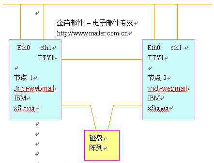 本項目采用金笛集群郵件系統(tǒng),通過兩臺IBM PC服務(wù)器實(shí)現(xiàn)高可用性。支持SMTP, POP3,IMAP等主流協(xié)議,支持WebMail,支持郵件列表等功能,同時要求兼容性好,與網(wǎng)站其他業(yè)務(wù)系統(tǒng)沒有沖突。