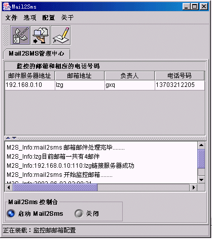 此窗口主要用來顯示Mail2SMS與所監(jiān)控郵箱的連接狀態(tài),及啟動(dòng)與關(guān)閉Mail2SMS的監(jiān)控功能。如上圖所示點(diǎn)擊左側(cè)的藍(lán)色按鈕開始對(duì)所設(shè)置的郵箱進(jìn)行監(jiān)控;點(diǎn)擊即可停止對(duì)郵箱的監(jiān)控。