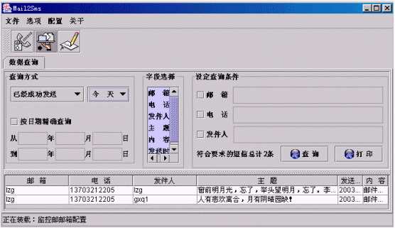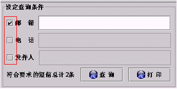 ·也可以通過給定查詢條件來查詢某項(xiàng)內(nèi)容,如針對(duì)某個(gè)郵箱、手機(jī)電話或發(fā)件人,方法是通過點(diǎn)擊左邊的小方框來選中,然后輸入相應(yīng)內(nèi)容即可,如下圖: