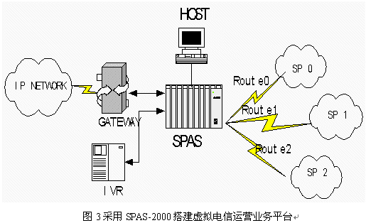 中國加入WTO后,國內(nèi)與國際的聯(lián)系、交流和溝通將會越來越頻繁,這一趨勢帶來了巨大的電信服務市場商機。同時,國際電信企業(yè)正在尋求進入中國的途徑,國內(nèi)新興的電信運營商積極應對這種局面,而虛擬電信運營商也在國內(nèi)開始出現(xiàn)。如何爭取客戶是所有這些提供電信服務的企業(yè)共同面臨的課題。一個智能化的、高效的、靈活的、有特點并易于控制的服務平臺無疑是他們進行競爭的重要工具。由于SPAS-2000可編程交換機是一個全開放的靈活平臺,用戶通過應用程序幾乎可以完全控制交換,能很好的滿足用戶的需求。在此SPAS-2000可編程交換機上開發(fā)的電話批發(fā)及零售業(yè)務應用,配合計算機技術(shù),能靈活控制業(yè)務的路由選擇、費率計算并可提供個性化服務,為運營商降低運營成本,提高服務質(zhì)量給出了有效的解決方案。例如一個IP電話運營商在全球互連中可能有多個合作伙伴,每個合作伙伴提供的服務也不相同,為了節(jié)省費用并提高服務質(zhì)量,IP電話運營商需要根據(jù)時段、費率、通話質(zhì)量、接通率等指標智能選擇去話路徑。SPAS-2000可編程交換機提供編程開發(fā)接口,通過E1與IVR連接,在服務器上開發(fā)高層應用軟件,可以實現(xiàn)多種高級功能。同時SPAS還可以連接各種型號的網(wǎng)關。應用連接圖見圖3: