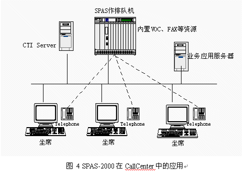 目前國內(nèi)呼叫中心的建設方興未艾,企業(yè)為了改善服務,贏得客戶,紛紛建設自身的呼叫中心。如果建立呼叫中心全部采用國外設備,價格非常昂貴,使很多客戶望而卻步。這樣大的投資目前也只有電信(包括移動和聯(lián)通)、電力、銀行等資金充裕的行業(yè)才能承受。而且,根據(jù)我方了解,即使這些行業(yè)也在控制采購成本,原先只注重名牌,不計成本的情況正在改變。而在目前宏觀經(jīng)濟形勢不景氣的大背景下,大中型企業(yè)既要加快企業(yè)信息化建設,保住客戶,降低成本,又要精打細算,規(guī)避投資風險。我們掌握建立呼叫中心設備的所有核心技術(shù),因此在呼叫中心應用方面有很大的價格優(yōu)勢,這樣就降低了擁有呼叫中心的門檻,在這個市場上也有很強的競爭力。采用SPAS-2000可編程交換機支持智能業(yè)務通用編程接口,可以作為CallCenter核心設備,應用圖見圖4: