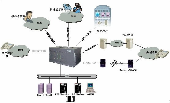 具有多種接口和信令,能與國(guó)內(nèi)外各種PSTN網(wǎng)和IP網(wǎng)連接