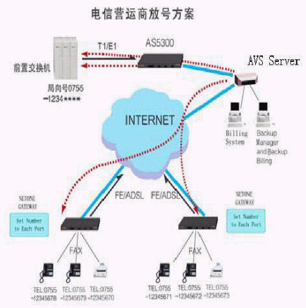 該方案適用于具有號(hào)碼資源的電信運(yùn)營商。電信運(yùn)營商利用Cisco AS5300網(wǎng)關(guān)或華為A8010網(wǎng)關(guān)(推薦)接入局端前置交換機(jī),接受話務(wù)后直接送往軟交換系統(tǒng)AVS,由AVS 來管理繁多的號(hào)碼資源及復(fù)雜的撥號(hào)規(guī)則。