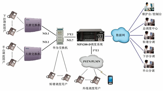 杭州繞城高速公路分成東西南北四段,此次,需要調(diào)度轉(zhuǎn)塘、下沙、半山等分處。目前,MPS2000-D指揮調(diào)度系統(tǒng)通過3個E1與華為交換機相連,基于原有通信網(wǎng)絡(luò),實現(xiàn)轉(zhuǎn)塘、下沙、半山調(diào)度用戶的接入。同時,指揮調(diào)度系統(tǒng)通過1個E1出局,實現(xiàn)外線調(diào)度用戶的接入,本次項目調(diào)度用戶共設(shè)置了120門。