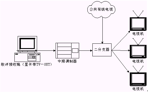 本系統(tǒng)接收端接收實(shí)時(shí)廣播時(shí),除了用普通PC機(jī)收看,或把PC機(jī)接收到的信號(hào)輸?shù)诫娨暎ù笃粒┥鲜湛矗踔吝可以接入有線電視網(wǎng)進(jìn)行播放。具體方法是通過(guò)一個(gè)接收端接收股評(píng)節(jié)目,通過(guò)帶TV-OUT的顯卡把TV信號(hào)輸出到中頻調(diào)制設(shè)備,中頻調(diào)制設(shè)備可以把基帶模擬信號(hào)轉(zhuǎn)換成一個(gè)有線電視信號(hào),且傳輸距離遠(yuǎn),損失小,再把這個(gè)信號(hào)與有線電視信號(hào)一起接入一個(gè)二分支器(2進(jìn)1出),這就可以和公共有線電視共存,形成自己的頻道,供電視接收。