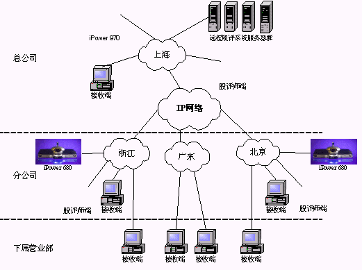 某證券公司有三級(jí)網(wǎng)絡(luò),總公司、分公司和下屬營(yíng)業(yè)部。總公司到分公司帶寬是2M,在總公司配置一套會(huì)議室型電視會(huì)議終端POLYCOM 970和一套多點(diǎn)會(huì)議服務(wù)器Radvision ViaIP400。在分公司配置了38套會(huì)議室型電視會(huì)議終端POLYCOM 680,用于與總公司進(jìn)行雙向視頻會(huì)議。分公司到營(yíng)業(yè)部帶寬是512K,各營(yíng)業(yè)部安裝遠(yuǎn)程股評(píng)系統(tǒng)接收端程序,遠(yuǎn)程股評(píng)系統(tǒng)服務(wù)器都放置在海通總公司。當(dāng)在總公司進(jìn)行股評(píng)時(shí),總公司本地?cái)z像頭拍攝教師畫(huà)面,MIC采集教師聲音,傳給服務(wù)器編碼,再通過(guò)網(wǎng)絡(luò)供各個(gè)接收端接收;當(dāng)在分公司進(jìn)行股評(píng)時(shí),首先分公司的電視會(huì)議設(shè)備采集教師畫(huà)面及聲音傳回總公司的電視會(huì)議設(shè)備,再傳給遠(yuǎn)程股評(píng)系統(tǒng)的服務(wù)器進(jìn)行編碼,然后通過(guò)網(wǎng)絡(luò)發(fā)布,供接收端接收。(結(jié)構(gòu)如下圖)