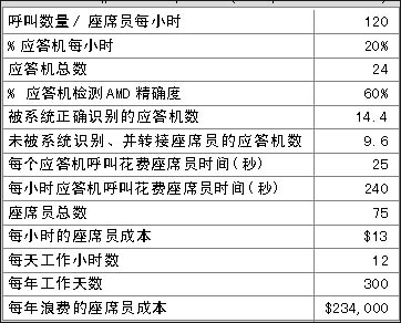 表1和表2表明在一個(gè)呼叫中心中精確的應(yīng)答機(jī)檢測(AMD)給企業(yè)所帶來的價(jià)值,兩表之間關(guān)于呼叫中心運(yùn)營的費(fèi)用每年相差$175,500。那么不同的AMD精確度意味著什么?在上例中,精確度每增加1%意味著每年會(huì)減少約$5,850的損失。