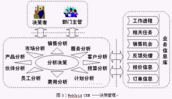 WebGrid CRM是基于CRM理念而設(shè)計(jì)的,它將面向客戶的所有業(yè)務(wù)進(jìn)行整合,提供了統(tǒng)一的業(yè)務(wù)平臺(tái),并使用工作流技術(shù)將各種業(yè)務(wù)緊密聯(lián)系起來。WebGrid CRM 的功能可以歸納為三個(gè)方面:1) 對(duì)銷售、營銷和客戶服務(wù)三部分業(yè)務(wù)流程的信息化;2) 與客戶進(jìn)行溝通所需要的手段(如電話、傳真、網(wǎng)絡(luò)、Email等)的集成和自動(dòng)化處理;3) 對(duì)上面兩部分功能所積累下的信息進(jìn)行的加工處理,產(chǎn)生客戶智能,為企業(yè)的戰(zhàn)略戰(zhàn)術(shù)的決策作支持。見下圖所示:
