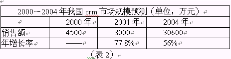 國內(nèi)CRM市場(chǎng)經(jīng)過一段時(shí)間的快速增長,2000年銷售額達(dá)到4500萬元左右。2001年市場(chǎng)情況將更好,預(yù)計(jì)銷售額將是上年的兩倍左右。CCID根據(jù)大量調(diào)查分析,對(duì)我國CRM市場(chǎng)規(guī)模作出如下預(yù)測(cè):