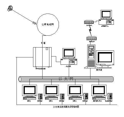 | ZQ-315電話投訴服務(wù)系統(tǒng)由如下各部分組成: 4呼叫排隊交換系統(tǒng) 4座席臺 4數(shù)據(jù)庫服務(wù)器 4系統(tǒng)維護管理臺 4同步數(shù)字錄音系統(tǒng) 4遠程通訊模塊 4遠程維護終端 各部分通過集線器和五類雙絞線組成快速以太網(wǎng);各節(jié)點之間采用TCPAP協(xié)議,以 Socket方式進行通訊。其組成結(jié)構(gòu)如下圖所示。 ![]() 1.呼叫排隊交換系統(tǒng) 4與公用電話網(wǎng)相連,將來話分配到座席臺或遇忙排隊 4自動應(yīng)答來話,完成自動受理投訴與自動查詢服務(wù) 4進行呼叫轉(zhuǎn)移 2.座席臺 4人工應(yīng)答來話 4顯示主叫號碼、戶主與地址等信息(根據(jù)需要) 4計算機輔助投訴受理 4計算機輔助業(yè)務(wù)咨詢(法律。個案等) 3.?dāng)?shù)據(jù)庫服務(wù)器 4運行網(wǎng)絡(luò)操作系統(tǒng) 4運行數(shù)據(jù)庫系統(tǒng) 4提供各種數(shù)據(jù)服務(wù) 4對網(wǎng)絡(luò)安全性進行檢查控制 4.系統(tǒng)維護管理臺 4對數(shù)據(jù)庫進行維護管理 4查詢各種業(yè)務(wù)數(shù)據(jù),生成統(tǒng)計報表。 5.同步數(shù)字錄音系統(tǒng) 4將模擬話音轉(zhuǎn)換成數(shù)字信號,并壓縮存儲。多路錄音,互不干擾 4支持多種語音數(shù)據(jù)壓縮格式(如PCMchDPCM、WAV等) 4播放放音 6.遠程通訊模塊 4與上級或遠程系統(tǒng)進行通訊。 7.遠程維護終端 4遠程撥號登陸系統(tǒng),對系統(tǒng)進行全面維護 |