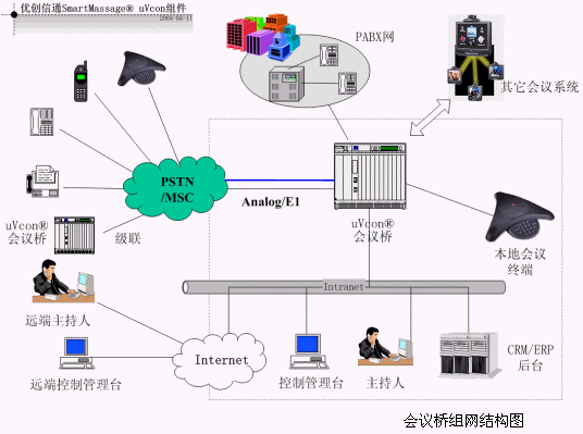 uVcon®會議橋是優(yōu)創(chuàng)科技(www.chinactn.com)的多媒體通信平臺SmartMessage®(見附錄)產(chǎn)品系列的音頻產(chǎn)品,功能包括建立會議、消息發(fā)布控制、會議數(shù)據(jù)記錄等功能。