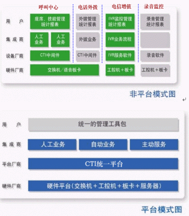 非平臺模式的系統(tǒng)建設(shè)需要采用多家設(shè)備,如不同廠家的交換機(jī)、語音板卡、CTI中間件、IVR服務(wù)軟件、錄音設(shè)備,以及相互獨(dú)立的、沒有統(tǒng)一設(shè)計的系統(tǒng)維護(hù)工具和業(yè)務(wù)界面。而平臺模式的系統(tǒng)建設(shè)只需要采用一家的設(shè)備,各業(yè)務(wù)模式在一個平臺上實(shí)現(xiàn),具備統(tǒng)一的管理工具。