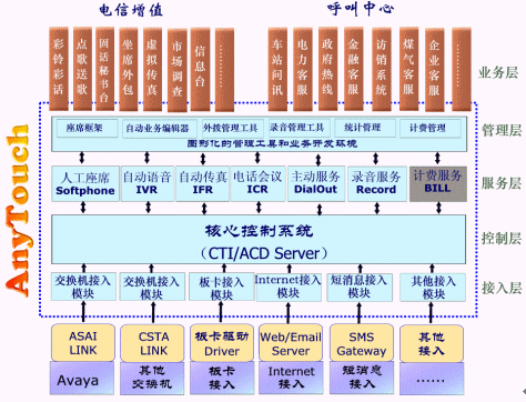 佳訊飛鴻近十年來一直致力于建設(shè)國內(nèi)一流的呼叫中心系統(tǒng)和電信增值業(yè)務(wù),其CTI方面的主打產(chǎn)品AnyTouch平臺廣泛應(yīng)用到電信、鐵路、軍隊(duì)、郵政、媒體、政府、電力、金融和商業(yè)等多個(gè)行業(yè)的呼叫中心、客服中心、CRM、電子商務(wù)和信息化平臺項(xiàng)目建設(shè)中。AnyTouch平臺是融合呼叫中心和電信增值業(yè)務(wù)的CTI應(yīng)用產(chǎn)品,是一個(gè)綜合的、集成的開發(fā)工具。她能夠構(gòu)建各種熱線電話系統(tǒng)、客戶服務(wù)系統(tǒng)、企業(yè)服務(wù)中心等呼叫中心業(yè)務(wù);同時(shí)可生成彩話、點(diǎn)歌、固話秘書臺、信息臺等電信增值業(yè)務(wù)。