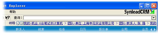 值得欣喜的是,部分CRM廠商意識(shí)到用戶(hù)迷路問(wèn)題的嚴(yán)重性,并清楚IE瀏覽器具備的頁(yè)面歷史尋址(History Location)功能滿(mǎn)足不了頁(yè)面內(nèi)數(shù)據(jù)庫(kù)復(fù)雜、動(dòng)態(tài)歷史條件的記憶,必須另外打造屬于CRM應(yīng)用程序自身的歷史堆棧。少許CRM軟件開(kāi)始提供歷史“后退”、“前進(jìn)”按鈕,SynleadCRM歷史精確度保持領(lǐng)先地位。