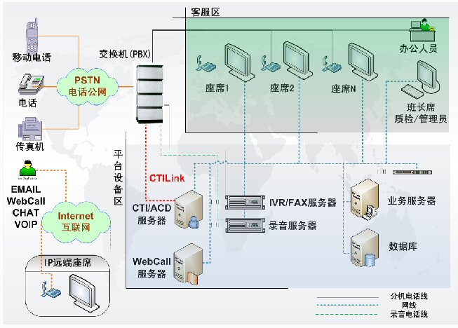 呼叫中心通信平臺,包含了交換機(PBX)、CTI服務(wù)器、IVR服務(wù)器、傳真服務(wù)器、全程錄音設(shè)備等幾個部分,是客服中心實施的基礎(chǔ)。