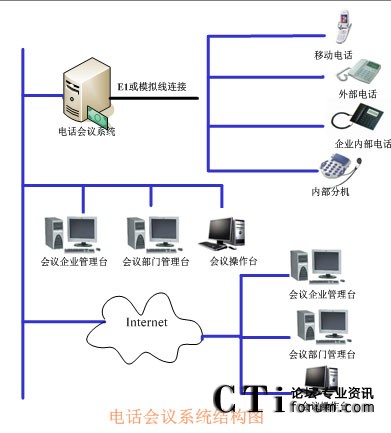 TalenTel CNF電話會議系統(tǒng)可以與程控交換機配合使用,也可以直接與局方的系統(tǒng)進行連接,系統(tǒng)的構(gòu)成含如下幾部分:TalenTel CNF電話會議系統(tǒng)服務器(ctsIVR)、會議企業(yè)管理員模塊、會議部門管理員模塊、會議操作員管理模塊、數(shù)據(jù)庫等組成。