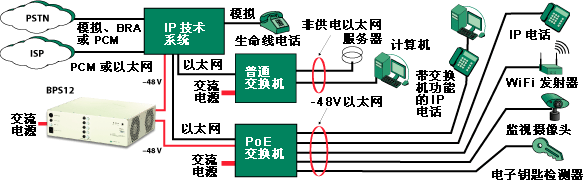 上圖顯示了如何將 BPS12 部署到典型的網(wǎng)絡(luò)中。該公司擁有一個(gè) IP 電話系統(tǒng),并使用 BPS12 來確保當(dāng)交流電源中斷時(shí)電話服務(wù)繼續(xù)工作。此方案中沒有使用