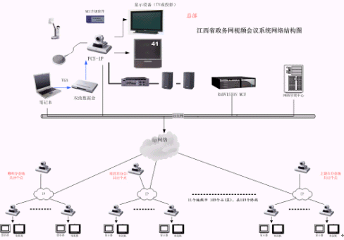 整個(gè)視頻會(huì)議系統(tǒng)擬在11個(gè)設(shè)區(qū)市會(huì)議電視管理中心和137個(gè)分會(huì)場(chǎng)(全省137個(gè)縣、區(qū)),共 120 個(gè)點(diǎn)。所有會(huì)場(chǎng)均采用SONY PCS-1設(shè)備,其中包括:南昌市12點(diǎn)、九江市14點(diǎn)、吉安市13點(diǎn)、景德鎮(zhèn)市4點(diǎn)、新余市4點(diǎn)、贛州市19點(diǎn)、宜春市10點(diǎn)、撫州市11點(diǎn)、萍鄉(xiāng)市6點(diǎn)、上饒市12點(diǎn)、鷹潭市4點(diǎn)等共11個(gè)地級(jí)市 137個(gè)縣(區(qū)), 其中在會(huì)議電視管理中心,和各級(jí)市的中心點(diǎn)放置PCS-DSB數(shù)據(jù)盒,用于培訓(xùn)中傳送雙流。