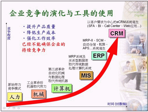 過去企業(yè)為取得同業(yè)間之競爭優(yōu)勢,無不絞盡腦汁針對(duì)『產(chǎn)品質(zhì)量』、『生產(chǎn)成本』及『工作效率』等作為主要改善目標(biāo),除了從本身管理制度的檢討改進(jìn)外,同時(shí)也積極運(yùn)用現(xiàn)代信息科技的力量,規(guī)劃出適合自己的企業(yè)e化版圖,以因應(yīng)全球化競爭時(shí)代的來臨,在此同時(shí)許多信息系統(tǒng)也逐步推動(dòng)導(dǎo)入企業(yè)內(nèi)部,包括:早期的MIS系統(tǒng)、近期的ERP系統(tǒng)、甚或電子簽核系統(tǒng)等,主要目的為提升內(nèi)部工作效率、節(jié)省內(nèi)部生產(chǎn)成本等作準(zhǔn)備,以『節(jié)流』為目標(biāo)強(qiáng)化企業(yè)自身的競爭能力。