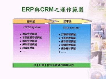 由上述可知,ERP系統(tǒng)主要應(yīng)用于業(yè)務(wù)人員接到訂單后,便開始進(jìn)入ERP系統(tǒng)的運(yùn)作范圍內(nèi),一直到產(chǎn)品出貨收到貨款為止,故接單前的業(yè)務(wù)開發(fā)、客情維系甚或報(bào)價(jià)管理等工作,其實(shí)并非其主要應(yīng)用范圍。