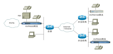 KVP6020采用模塊化設(shè)計(jì),支持FXS、FXO、E&M、E1等多種語(yǔ)音模塊,最大可支持40路FXS用戶(hù)接口,可用于總部和大、中型分支機(jī)構(gòu),提供IP語(yǔ)音通信業(yè)務(wù),也可通過(guò)FXO、E&M、E1等中繼接口與PBX、與PSTN相連,提供中繼匯接業(yè)務(wù),典型應(yīng)用如下圖。