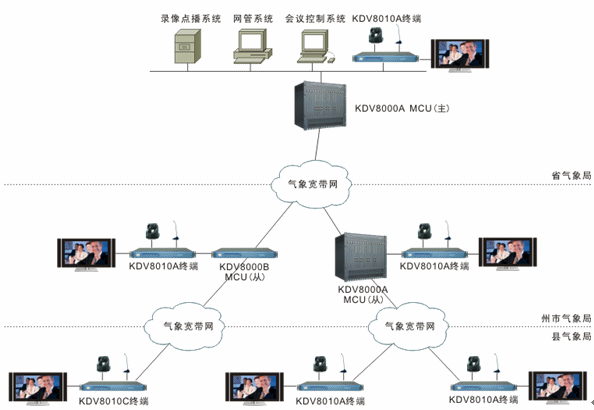 整個(gè)系統(tǒng)依托云南省氣象局自建的寬帶IP網(wǎng)絡(luò)進(jìn)行搭建。省氣象局與各州市氣象局的網(wǎng)絡(luò)連接可為視頻會議提供2M通信帶寬。各州市氣象局與各縣級氣象局的網(wǎng)絡(luò)連接可為視頻會議提供768K通信帶寬。整個(gè)系統(tǒng)采用MCU兩級級聯(lián)組網(wǎng)。