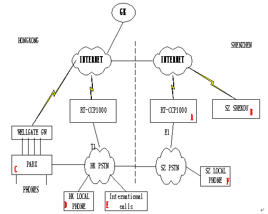 - A點(diǎn)是深圳福田的office,B點(diǎn)是深圳蛇口的辦事處,C點(diǎn)是香港總部的office,D點(diǎn)香港本地電話用戶,E點(diǎn)來自國(guó)際的呼叫,F(xiàn)點(diǎn)是深圳本地的電話用戶。