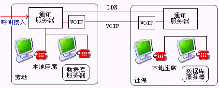 如某些城市勞動(dòng)和社保是業(yè)務(wù)分開(kāi),為共用12333接入號(hào)可采取此種方式,在呼叫首次接入時(shí)提示用戶選擇勞動(dòng)、還是社保咨詢服務(wù),如果選擇社保服務(wù)則通過(guò)DDN專線或VOIP將呼叫接入到社保的交換機(jī)中。