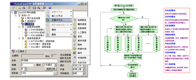 產(chǎn)品化、標準化、全功能、低價位,易于安裝使用,便于應用集成,為用戶實現(xiàn)呼叫中心應用節(jié)省了大量的資金、人力、時間;無需編程,可自定義呼叫服務流程,豐富的業(yè)務插件可以直接配置訪問后臺數(shù)據(jù)庫,滿足各類應用需要;組件式構造,易于擴容和功能擴展。