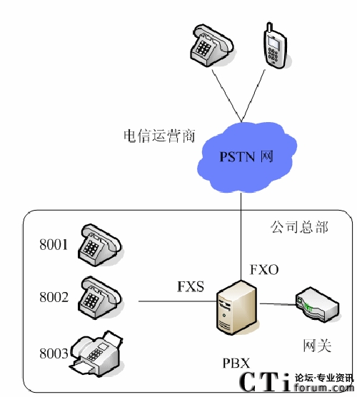 大多數(shù)公司目前都是使用PBX來提供電話業(yè)務(wù)的,PBX(小交換機(jī))直接放置在在公司內(nèi)部,對(duì)內(nèi)直接布置分機(jī),對(duì)外通過模擬中繼,與電信運(yùn)營(yíng)商的PSTN相連。