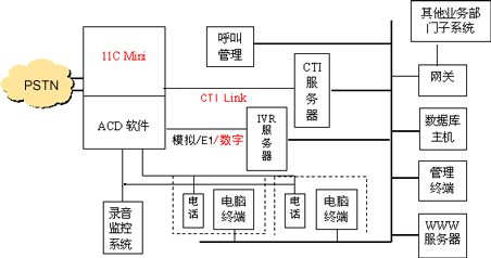 通過CTI Link M1D軟件,實(shí)現(xiàn)CTI服務(wù)器與11C Mini交換機(jī)之間進(jìn)行呼叫狀態(tài)傳遞和呼叫控制,支持北電ACD、CDN等先進(jìn)排隊(duì)技術(shù)。同時(shí)還為客戶端提供CTC