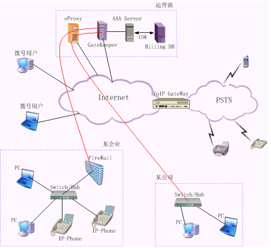 運(yùn)營級(jí)IP電話解決方案為運(yùn)營商提供一種可靠經(jīng)濟(jì)的VoIP接入平臺(tái)與VoIP骨干網(wǎng)互連,這種方式可以充分利用網(wǎng)絡(luò)資源,降低用戶服務(wù)價(jià)格,提高運(yùn)營商的競爭力。它為用戶提供了多種業(yè)務(wù)類型,除了可以實(shí)現(xiàn)任意兩點(diǎn)間的PC互通外,還可以實(shí)現(xiàn)PC通過VoIP網(wǎng)關(guān)與PSTN用戶間的互聯(lián)互通。